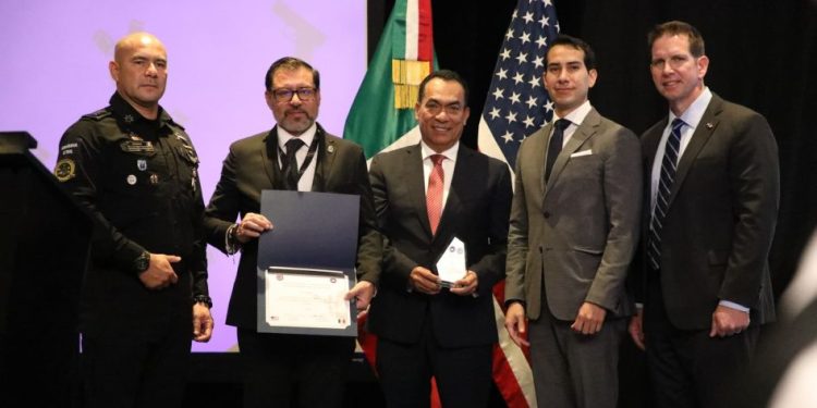 José Vega, oficial adjunto del Programa INL (Oficina de Asuntos Internacionales de Narcóticos y Aplicación de la Ley), y Shawn Morrow, subdirector adjunto de Agencia de Alcohol, Tabaco, Armas de Fuego y Explosivos (ATF), entregaron el reconocimiento al titular de la SSP Juan Carlos Oseguera Cortés, y al Fiscal General del Estado, Adrián López Solís, por la dedicación de ambas instituciones para consolidar un entorno de mayor tranquilidad en el estado.